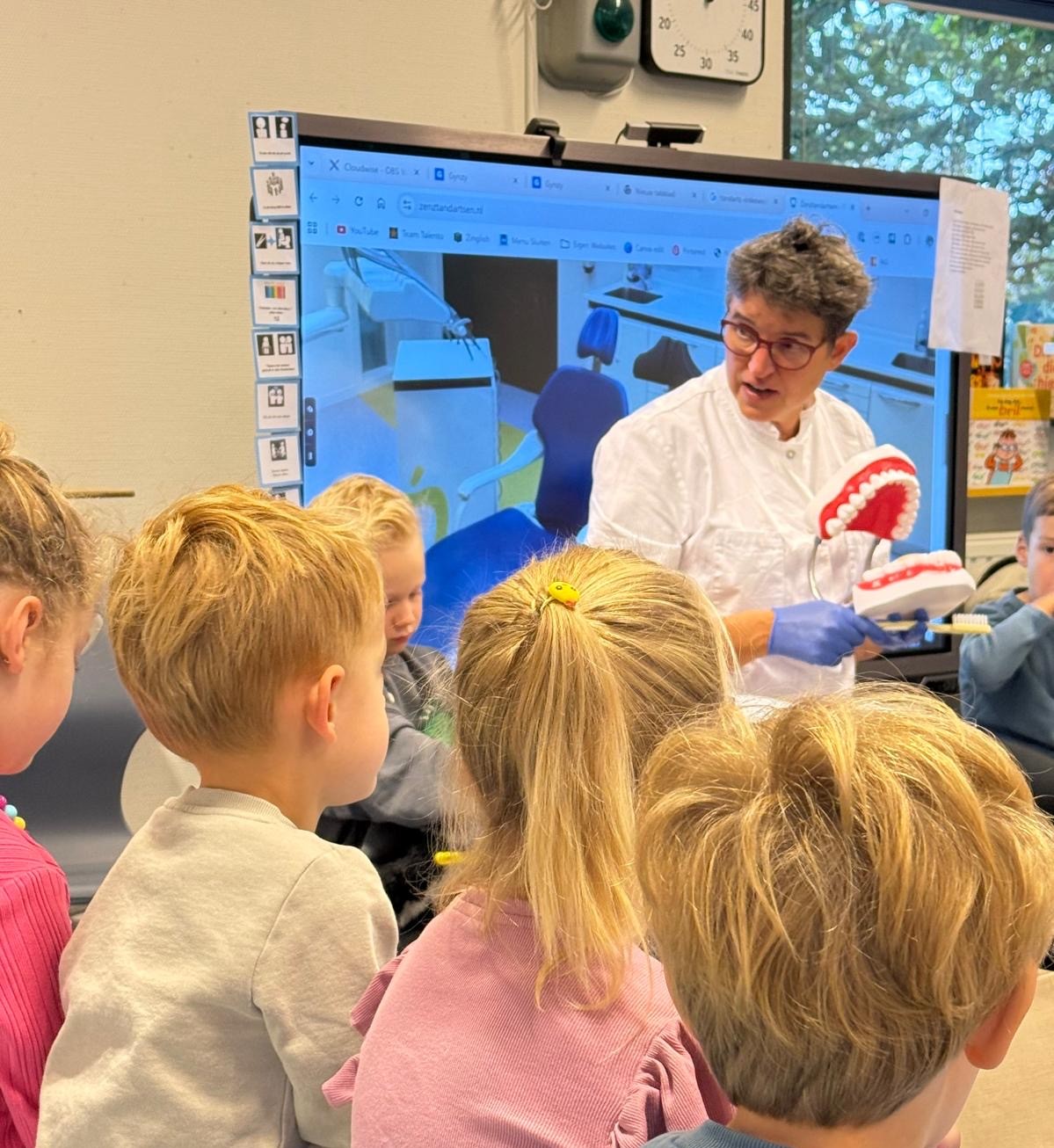 De kleuters van basisschool Willespoort te Wilnis hebben vanmorgen bezoek gehad van mondhygiënist Monique. We hebben in de drie groepen gesproken over gebitscontrole door tandarts/mondhygiënist, tweemaal daags poetsen met hulp van ouders en weinig snoepen. Onze poetsaap en nepgebit werden door de ruim 75 leerlingen zeer zorgvuldig gepoetst en tot slot kreeg ieder kind een tandenborstel, tubetje tandpasta en informatiefolder van het project www.houjemondgezond.nl mee naar huis. Het was een geslaagde ochtend