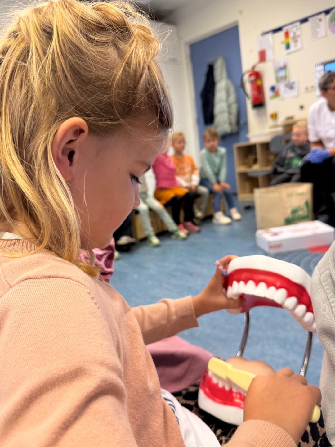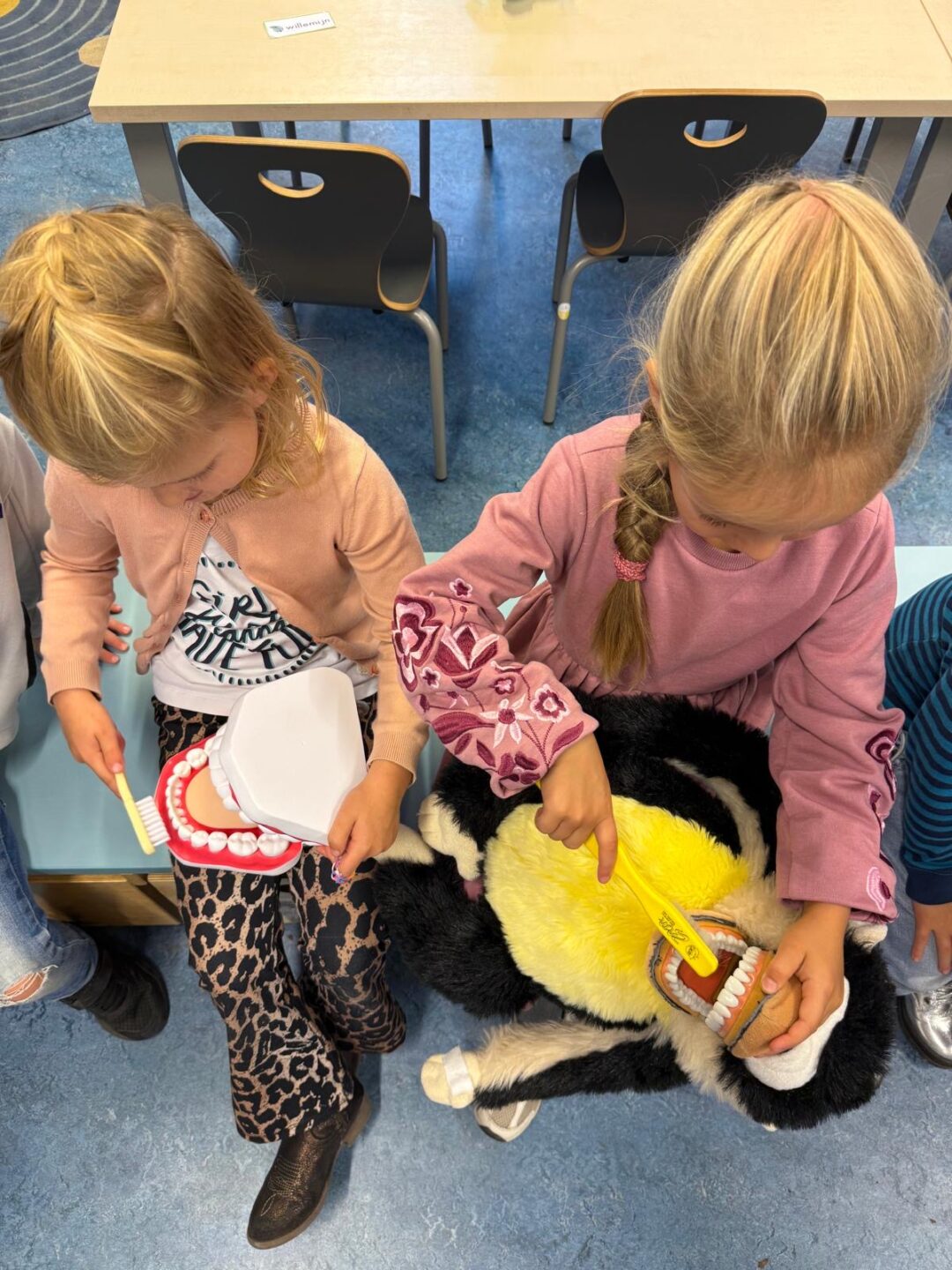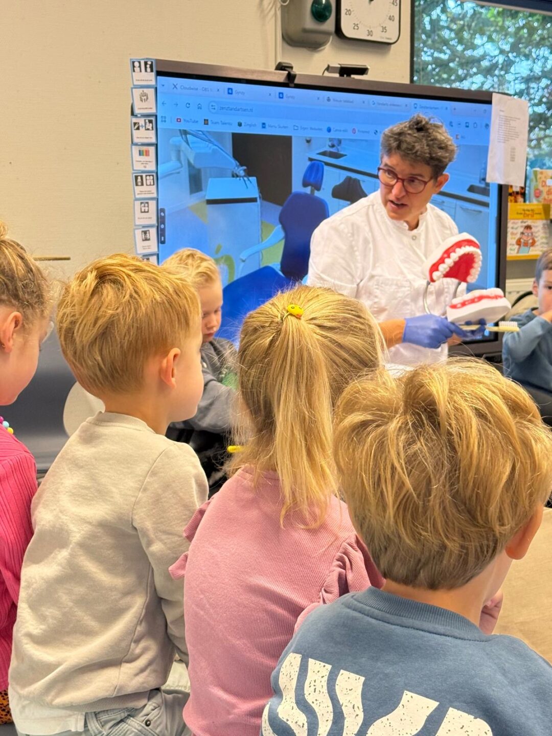 De kleuters van basisschool Willespoort te Wilnis hebben vanmorgen bezoek gehad van mondhygiënist Monique. We hebben in de drie groepen gesproken over gebitscontrole door tandarts/mondhygiënist, tweemaal daags poetsen met hulp van ouders en weinig snoepen. Onze poetsaap en nepgebit werden door de ruim 75 leerlingen zeer zorgvuldig gepoetst en tot slot kreeg ieder kind een tandenborstel, tubetje tandpasta en informatiefolder van het project www.houjemondgezond.nl mee naar huis. Het was een geslaagde ochtend