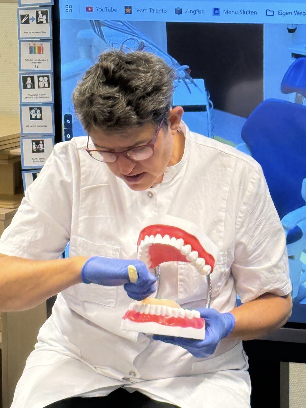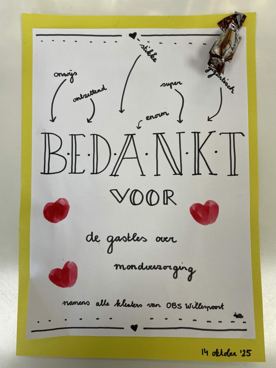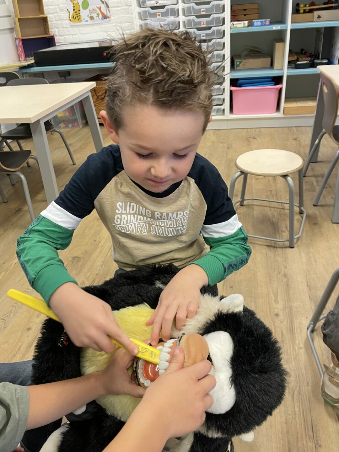 De kleuters van basisschool Willespoort te Wilnis hebben vanmorgen bezoek gehad van mondhygiënist Monique. We hebben in de drie groepen gesproken over gebitscontrole door tandarts/mondhygiënist, tweemaal daags poetsen met hulp van ouders en weinig snoepen. Onze poetsaap en nepgebit werden door de ruim 75 leerlingen zeer zorgvuldig gepoetst en tot slot kreeg ieder kind een tandenborstel, tubetje tandpasta en informatiefolder van het project www.houjemondgezond.nl mee naar huis. Het was een geslaagde ochtend