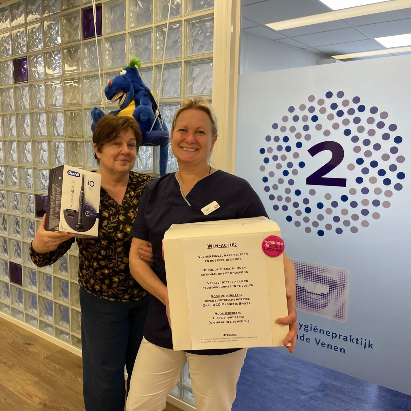 De winnares van onze puzzelprijsvraag tijdens De Week van de Mondhygiënist is bekend. Gosia Hakker had de woordzoeker goed ingevuld en daarbij het geluk dat haar formulier uit de 71 inzendingen getrokken werd. Gosia ontving de mooie elektrische tandenborstel uit handen van onze collega Agnes. Alle deelnemers bedankt voor het meedoen en Gosia; veel poetsplezier!